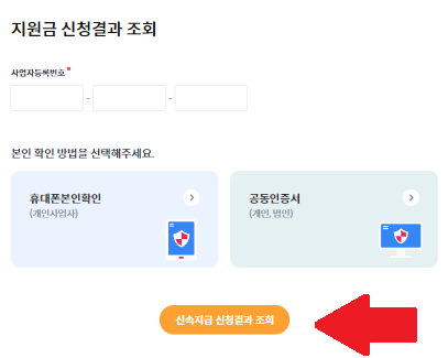 3. 지원금 신청결과 조회화면에서 사업자등록번호를 넣고 개인 인증을 합니다. 개인 인증은 휴대폰 본인확인(개인사업자)와 공동인청서(개인, 법인사업자) 두 개 중 하나만 하면 됩니다.