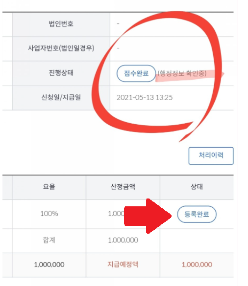6. 인증 결과를 보면 ‘접수완료(행정정보 확인중)’이라고 나옵니다. 다행히 접수는 정상적으로 된 경우이며, 증빙 서류를 검토하고 있는 것 같습니다. 검토가 종료되면 진행상태가 변경 될 것입니다. 백만원이 빨리 지급되기를 소망해 봅니다.